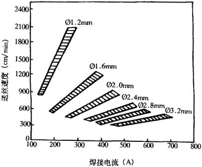 图5-37 送丝速度与焊接电流的关系 注:低碳钢、管状焊丝、CO2保护焊。 2.焊丝伸出长度和焊丝工作位置 送丝速度确定之后,焊丝伸出长度随焊接电流增大而减小。一般在19~38mm之间,过长飞溅增加,电弧稳定性变坏。太短飞溅物易堵塞喷嘴,造成保护不良,引起气孔等缺陷。焊丝位置:平焊时焊丝行走角在2°~15°之间,太大降低保护效果;角焊时焊丝的工作角在40°~50°之间。 |