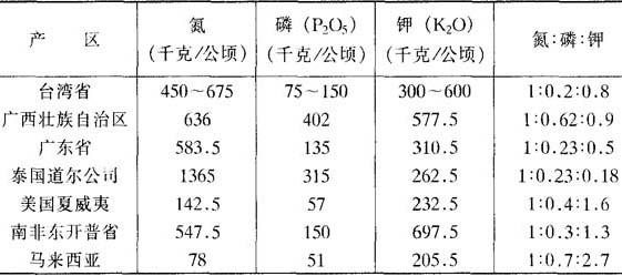 2.田间试验法 此法最能反映当地菠萝需要的养分供给量。据养分平衡原理,先算出菠萝各种需求量,然后依此数据制定田间肥效试验,对各养分进行高肥量、低肥量试验,据试验结果,再提出适合当地气候条件下的施肥比例与用量。综合各地施肥方案,菠萝的施肥量与比例见表6-19,属高钾或中钾、中氮、低磷的水平。由表6-19看出,要确定某一产区的合理、经济及最佳施肥量与比例,必须通过多年试验及对植株与土壤营养分析测定而定。一般热带地区的温、光、热、水优越,土壤较肥沃,施肥量较少,产量也较高;而南亚热带地区,由于土壤贫瘠及有季节性干旱、低温等因素,施肥量虽较多,产量并不高。 表6-19 世界与我国产区施肥量及三要素比例