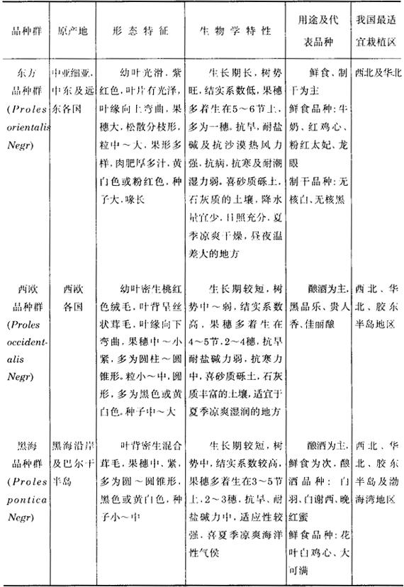 | 释义 | 葡萄的主要种 葡萄属于葡萄科(Vitaceae),葡萄属(Vitis)。葡萄科共有11个属,约600余个种。其中经济价值最高的是葡萄属,它有70多个种,我国约有35个种。它分布在世界上北纬52°到南纬43°的广大地区。一般按地理分布和生态特点,可分为欧亚种群、东亚种群和北美种群三个种群。欧亚种群具有最大的经济价值,绝大多数栽培种均属此种群;其次为北美种群和东亚种群。它们的起源与特性如下: 一、欧亚种群 欧亚种群起源于欧亚大陆,因受冰川时期的变迁致使许多野生种均已灭迹,仅留下一个欧亚种,它分布亚洲西部、欧洲南部的温带与亚热带和北非洲地带,是世界的主要栽培种,其产量约占总产量的90%。经过长期选择与培育,目前已有8000个以上的品种,但它们因受地理条件和生态因素等的影响而形成三个品种群,其起源、特点、用途等如表1-1-1所示。 表1-1-1 欧亚种群不同品种群的特征与特性