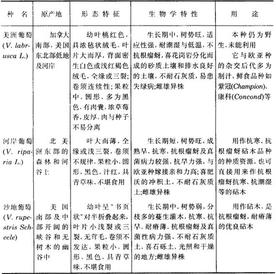 此外还有刺葡萄(V.davidii Foex)、毛葡萄(V.quinquangularis)、秋葡萄(V.romanetii)、桑叶葡萄(V.ficifolia)等及其变种。 三、北美种群(也称美洲种群) 它起源于北美广大地区,约有28~30种,其中起源于美洲南部的较抗旱,抗根瘤蚜与真菌病害,而起源于美洲西北部的则较抗寒(能耐-30℃以下的低温),但不抗根瘤蚜和不耐石灰质土壤。其主要种的特征与用途等如表1-1-3所示。 表1-1-3 北美种群主要种的特征与特性