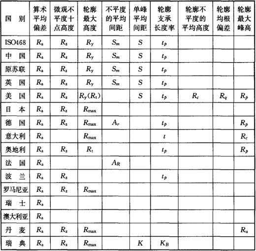注:(1)选用tp时必须同时给出轮廓水平截距c值。它可用微米或Ry的百分数表示。百分数系数如下:Ry的5、10、15、20、25、30、40、50、60、70、80、90(%)。 (2)S的最小间距规定为取样长度l的1%。轮廓峰(谷、单峰、单谷)的最小高度规定为Ry的10%。对Ra、Rz和Ry亦适用。 3.我国与国外主要国家表面粗糙度评定参数及符号对照(表1-30) 表1-30 中国与国外主要国家表面粗糙度评定参数及符号对照