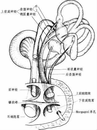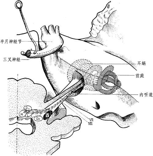图11-1 听神经总观 第八对脑神经包括以下两条神经: (1)耳蜗神经:粗、扁平,通常位于第八对神经的内前2/3。 (2)前庭神经:较细、圆形,通常在第八对神经的后外1/3;实际上其粗细至少要同于耳蜗神经(Aubry-Ombredamne)。长约24mm,粗4mm,在三叉神经下边。它完全是颅内神经。 二、外表起源 此神经是延髓-脑桥的外侧部分 与传统的见解相反,目前认为有二个远处的起源:①背部的,第四脑室底板为耳蜗神经纤维的起始;②腹部的,延髓的外侧隐窝为前庭神经纤维的起始处。 最近提出: (1)第八对脑神经的两部协同产生自延髓的外侧隐窝,在延髓-脑桥沟的外侧端,面神经bis(Ⅶbis)的外方; (2)耳蜗神经纤维位于前庭神经纤维的内下方。此二神经在该处不分开; (3)两条神经纤维发出后马上又融合一起,呈圆柱状。 三、行程(图11-2)