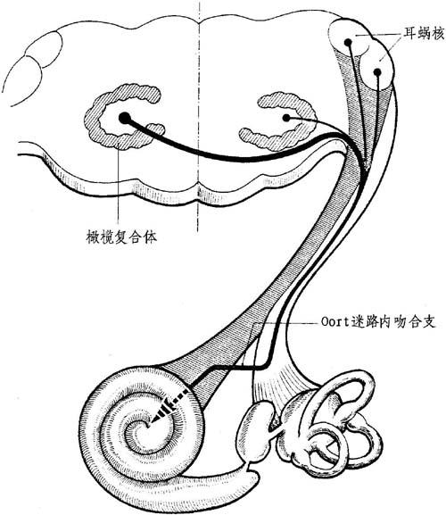 图11-7 耳蜗外周传入途径 听神经细胞体位于螺旋神经节中,可分辨出(Spoendlin)两类神经节细胞:①Ⅰ型细胞(占神经元的95%)是双极的,有髓的神经元有一个很大的细胞体;②Ⅱ型细胞,较小,无髓,此神经元呈单极外观。 Ⅰ型神经元借其树突与内毛细胞发生联系,而Ⅱ型的与外毛细胞发生联系。 (2)传出途径由中枢出发,担负着调节耳蜗的功能。 此途径组成Rasmussen橄榄耳蜗束。 起源:此束包括:①直接纤维,产生于同侧上橄榄核复合体并为橄榄-耳蜗束的1/4。②交叉纤维在脑干里相互联成单独一束。 行程:橄榄耳蜗束首先获得前庭神经干。然后在内听道底,借 Oort迷路内吻合支,再连接耳蜗神经。 终止:存有两种不同的解剖类型:①行向外毛细胞的纤维显粗大,是大细胞,通过一辐射行程直接连接毛细胞。②行向内毛细胞的纤维,由内侧上橄榄核的小细胞产生,通过螺旋行路再接通毛细胞。 这种传出支配在耳蜗基底转处非常丰富。 2.外周前庭途径 包括: (1)平衡传入途径:前庭神经元联合斑细胞和壶腹嵴到延髓-脑桥前庭核。 其细胞体位于前庭神经节内。这些双极细胞,其树突纤维来自感觉上皮,在前庭神经干中的轴突纤维进入中枢神经核。约有20000条有髓传入纤维。 (2)传出途径:组成 Petroff和 Gacek传出束,产生于前庭核群毗邻的网状结构,其纤维分布到感觉细胞中。因此,一根传出纤维可连接60根传入感觉纤维。 |