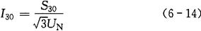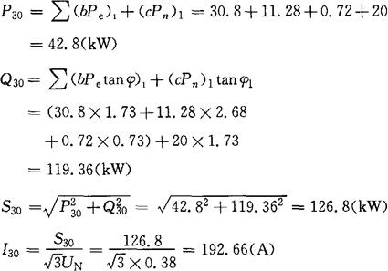 式中 Pe——等效三相设备容量(W); Peφ——接于线电压的单相设备容量(W)。 等效三相计算负荷可按前述需要系数法确定。 5.用需要系数法确定全厂的计算负荷 将全厂用电设备总容量乘以全厂负荷的需要系数即可确定全厂的计算负荷。 全厂有功、无功、视在计算负荷及计算电流 Q30=P30tanφ (6-31)