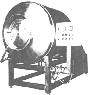 图3-5-11 真空滚揉机 国产ZGR型真空滚揉机的卧式滚筒筒体前面设有端盖,在中心位置处装有旋转导气管接头,连接筒内垂直向上的吸气管,它可防止肉沫吸入真空泵。另一端与XD-063型真空泵连接,当真空泵启动后,筒内形成真空。筒体后部设有变速转动装置,筒体在旋转状态下连续抽真空。控制面板上装有筒体及真空泵,启动、停止、出料等按钮,电动总开关,指示灯,真空表和三只定时器。只要按工艺要求设定时间为自动正转-暂停-反转-暂停-正转循环自动运行,达到总时间设定值时,机器就会自动停车。 进料采用真空吸入,只要将肉车与筒体进料口之间用快速接头接上吸料管,盖上端盖,开启真空泵,即可将肉料吸入筒内。自动出料时,只要打开真空阀,打开端盖,将桶车接于出料口下方,按控制板上出料按钮,滚筒反转即可自动将肉料送入桶车。滚筒及肉料全部重量借两对耐磨尼龙1010制造的滚动托轮支撑。当滚筒转动时,筒内桨叶强烈挤压,使肉块表面的肌肉组织间相互摩擦摔打,而不出现整块肉的翻转运动,从而使盐溶的蛋白质渗出,旋转的次数越多,肌肉组织相互摩擦越多,提取的盐溶蛋白质也越多,它在肌肉组织间起到胶水样的作用,在肌肉表面形成一种黏性薄膜而起到保水作用。 |