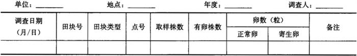 2.4 卵、幼虫量普查 在成虫产卵盛期和幼虫为害盛期各查3次。卵量普查可在卵始盛期开始,以后每5天查1次。幼虫普查分别于一龄、三龄、五龄盛期各查一次,时间可用历期法推算。每次普查6~10块田,每田查5点,随机取样,每点查10~20株,幼虫分龄。将调查结果记入豆天蛾田间卵和幼虫调查表(表4-153)。 表4-153 豆天蛾田间卵和幼虫调查表