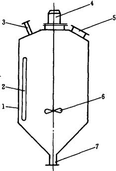 图1-14-19 混合机结构示意图 1-罐体 2-液面指示器 3-进料口 4-传动装置 5-观察孔 6-搅拌器 7-出料口 混合机是用于将添加剂与豆浆混合均匀。工作时将豆奶和各种添加剂从进料口3输入罐内,开动搅拌器6进行搅拌,以使各种物料分布均匀。在罐体1上有一液面指示器2。混合机在豆奶生产线上,应配置2台交替使用,以保证整个生产过程的连续进行。 3.4 真空消泡罐(图1-14-20)