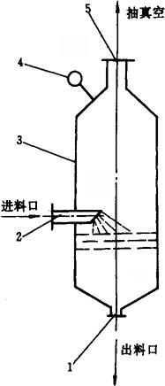 图1-14-22 高温杀菌罐 1-温度传感器 2-蒸汽进管 3-压力表 4-豆奶进管 5-豆奶喷头 6-蒸汽喷嘴 7-罐体 8-出料口 3.5.3 真空脱臭罐(图1-14-23) 真空脱臭罐用于将经高温杀菌灭酶后的豆奶,进行脱除异味及迅速降温。该机的基本工作原理是利用经高温杀菌后的高温高压豆奶,通过豆奶喷嘴6喷入具有一定真空度的罐体2时,由于突然降温降压,使喷出的液滴因水分的瞬间汽化蒸发爆破而细化。产生的蒸汽与挥发性气味,被抽真空系统通过废汽出口4吸出罐外。二次蒸汽与冷水进行热交换后凝结为冷凝水,同时夹带不凝结气体随冷水一起排出。因水汽化蒸发时,需吸收大量的热量,而在此过程中又无外部热能的补充,结果使得豆奶迅速降温,一般降至80℃左右。这时由于二次蒸汽被排出机外,因而豆奶的浓度也基本上恢复到开始蒸汽直接加热时水平。脱臭效果及冷凝豆奶的终点温度,与豆奶流量、豆奶初始温度、罐内的真空度及罐的结构等因素有关。冷却后的豆奶通过底部的出料口7,被泵连续吸出送入下一道工序。