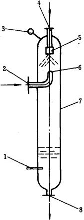 图1-14-21 蒸汽喷射式加热器 1-蒸汽进口 2-喷嘴 3-豆奶进口 4-本体 5-喷管 6-热豆奶出口 7-扩散室 8-混合室 9-吸入室 3.5.2 高温杀菌罐(图1-14-22) 高温杀菌罐用于豆奶的杀菌灭酶处理。工作时,从加热器出来的豆奶,经连接管路直接进入豆奶喷头5,并呈分散成雾状的微小颗粒喷入罐内,与从蒸汽喷嘴6出来的干热蒸汽接触后,在瞬间完成热交换使豆奶升温。蒸汽释放汽化潜热后,冷凝成水与热豆奶颗粒一起在重力作用下,落到罐底,从出料口8经连接管路直接进入真空脱臭罐,进行真空脱臭。罐内应维持一略高于与操作温度相应的饱和蒸汽压的压力,以防水分汽化,影响正常工作。罐内压力可在压力表上读出。温度控制则通过温度传感器,将信号传给自动控制装置,控制电磁阀的开关来实现蒸汽量的调节,达到温度的控制。