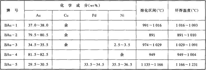 | 释义 | 贵金属钎料 (1)金基钎料 表3-5中列出了美国焊接学会标准中的金基钎料,原则上这些钎料均可用于不锈钢钎焊,但实际上用于不锈钢钎焊的主要是BAu-4。该钎料钎焊不锈钢时,填充钎缝的能力非常强,既适应窄钎缝也适应较宽的钎缝。钎料的金相组织为单一的金镍固溶体,钎焊接头不仅强度高而且塑性好。该钎料钎焊的不锈钢接头的耐蚀性非常好,在许多工作环境(如含硫气氛)中强于镍基钎料。该钎料同样具有很好的高温抗氧化性。但钎料高温强度不如镍基钎料,钎焊接头的工作温度一般在650℃以下。钎料可加工成任何形状提供使用,但由于钎料很贵,一般用于关键部件的钎焊,如航空、航天部件,核反应堆部件。 表3-5 美国焊接学会标准中金基钎料