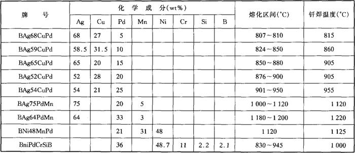 (2)含钯钎料 含钯钎料有许多,表3-6中列出了一些银铜钯、银钯锰和镍基含钯钎料,均可用于不锈钢的钎焊。 表3-6 可用于不锈钢钎焊的含钯钎料