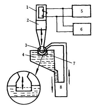 1—磁滞伸缩换能器;2—变幅杆;3—工具;4—磨料悬浮液;5—超声波发生器;6—直流电源;7—工件;8—泵