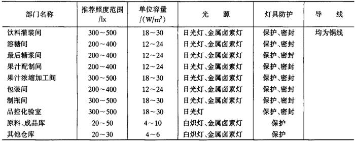 3.冷冻机房配电 用氨作制冷剂时,冷冻机房属于Q3级爆炸危险场所,除考虑事故排风装置外,配电设备应尽量采用密闭式,导线选用铝芯线。 4.冷藏库配电 冷藏库属潮湿环境,配电装置应考虑防水型。冷藏库外部干线、支干线可考虑用铝芯线,冷藏库内均用铜芯线。冷藏库内冷风机应有运用指示和断相保护。 (二)车间照明 1.车间照明一般原则 (1)照明电源在车间内部必须与动力分开,应留有备用回路。主要生产车间宜装设值班照明和疏散照明。 (2)生产照明普遍使用日光灯,车间层高超过6m时可采用金属卤素灯。路灯一般采用中显色钠灯或金属卤素灯。 (3)饮料车间使用的日光灯应有防湿措施、开关最好分批集中控制,有利于车间整洁卫生。路灯集中传达室控制。 (4)糖浆车间、水处理间、餐厅、厨房、糖库、包装区等需装设灭蝇灯。 2.照明技术参考指标 照明技术参考指标见表6-7-21。 表6-7-21 照明技术参考指标