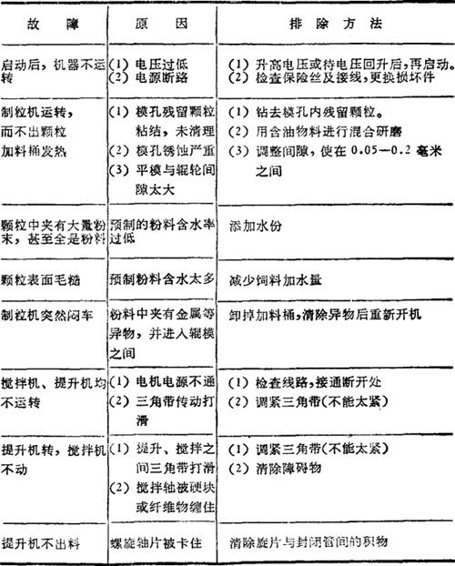 机组:颗粒直径4(2.5,6)毫米;产量≥150公斤/时(折算到颗粒含水率13%);配套总功率8.62千瓦;外形尺寸(长×宽×高)1200×850×1500毫米;重量590公斤。 (3)机组如何使用 新模具使用前,由于出厂时平模模孔有各种不同程度的粗糙性,欲达高产量,低电耗和制粒均匀等条件,要先用油质粉料混和物,后用混合粉料抛光模孔的内表面。这一过程一般10小时以上。 使用前准备: ①检查电源情况,一般电压低于360伏时不宜开机,否则机组在工作时容易过载闷车或温升异常,甚至毁坏电机。 ②检查辊轮与平模间隙,因为辊模间隙是直接影响制粒质量和产量的重要因素。规定间隙调节范围为0.05-0.2毫米,过大,粉料进入间隙不易挤入模孔,产生打滑发热现象,严重时,甚至挤压不出颗粒;过小,辊轮与平模又会产生直接摩擦,所以制粒前应进行空载运转,观察是否正常,调整方法是调节间隙垫片和辊轮架上方的六角螺母和盖形螺母。 ③检查加工的粉料,切忌金属物、纤维緾绕物等有损机器的异物进入。了解原料的配方、含水率,以便制粒时正确掌握。象草粉类含大量纤维的物料,通常产量低、功率高,而豆饼、菜饼等含油量高的物料,产量高、颗粒表面较为光洁。饲料含水率是制粒过程中的重要因素,不加水或加水量过少,便不成形,过多,导致产量下降、功耗上升、颗粒表面毛糙。 启动和操作顺序: ①关闭搅拌筒底部的插板和搅拌、提升间的操纵杆门,然后启动传电机,此时须注意搅拌轴旋转方向,旋向应为顺时针。 ②将原料投进搅拌筒,考虑到干状粉料增湿后会膨胀,故一次不宜放得太满,以3/4筒左右为佳。在搅拌的同时,启动水泵喷洒水份,加水量由水箱边的标管显示,或观察所制的颗粒,表面光洁性,手捏柔软有弹性,说明水份适中。 ③混合料搅拌均匀后,开启搅拌筒底部的插板,将拌和料放入储料桶,当放满时要减慢放料速度,以免堵塞闷车。 ④启动制粒机,逐渐拉开操纵杆,将混合料通过提升机缓慢送入制粒机造粒,注意观察负载指示器(制粒机的电流表)的指针摆动,指针指在额定负载(电机的铭牌上标有额定负载电流值)的左面,表示制粒机是在低于额定负载的状况下运转,反之是超载了。不允许制粒电机超载几分钟,一般负载电流9-11安培为最佳工况区。 停机顺序: ①开启搅拌底部的插板。 ②拉开操纵杆,排空搅拌机和提升机的涂料。 ③将油性物料倒入加料斗,将正常的颗粒从平模中强行挤出,直到油性颗粒出现。 停机后,颗粒化模孔内冷却并紧粘在一起,给下次制粒造成困难,甚至制不出颗粒,只有拆下模具钻去粘结在模孔内的颗粒后,才能重新工作。故在停止运转时,平模孔应用含油的非腐蚀混合物填满。混合物可用锯屑浅粉状饲料,因为这些物料能很好地与机油或者相同的物质拌和。 (4)主要故障及排除 见表5-5。 表5-5 故障产生原因及排除方法