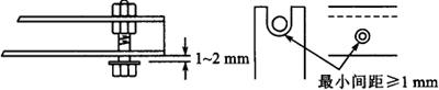 图25.7-2 轿底定位螺栓 (10)拉紧螺栓(防跳螺栓):安装拉紧螺栓是为了防止微动开关起用时,活动二层轿底从原来的位置跳开。主要是负载站立位置不均匀时,该螺栓可以起到补偿的作用。 拉紧螺栓应如图25.7-3所示安装,空载时,垫圈与轿厢框架间的间距应为1~2mm,垫圈的直径应大于轿厢框架的洞口。每台轿厢上有四个拉紧螺栓。