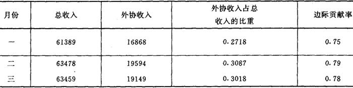 ①边际贡献就是创利额,边际贡献率就是创利率。 1-3月份的平均边际贡献率为0.77。各月边际贡献率的差距,主要是由各月外协比重不同引起的。因此,对外协收入占总收入的比重作了如下分析(见表4)。 表4
