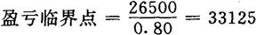 通过上表分析,发现外协收入占总收入的比重每提高0.01,边际贡献率将上升0.01左右,估计下个月的外协收入占总收入的比重会超过前三个月,故4月份的边际贡献率应修正为0.8。于是便可进行如下各项分析: (1)四月份的固定成本预计为26500元,盈亏临界点即可计算如下: