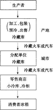 | 释义 | 运输中的其他环境条件 从产地到销地之间的距离和运输时间愈长,途中各种环境因素就变化越大,对果蔬品质的影响也愈大。 (一)温度与温度伤害 1.温度 温度是影响运输的重要环境条件之一。常温运输果蔬,在没有保温包装的情况下,其品温受气温影响而发生变动,尤其在夏季或严冬期间的影响就更为明显。 采取火车运输时,由于火车结构不同,受气温影响也不同。普通货车受气温影响而发生变化,而保温车运输的果蔬,其品温变化甚小。 从包装形式看,木箱包装运输与纸箱包装运输几乎相同,但纸箱堆积过密时在运输中要比木箱的温度升高1~2℃。 如果使新鲜果蔬从生产到消费的整个过程中,都保持在规定的低温范围内,这就是当前所提倡的低温流通,又叫冷链,包括运输、贮藏、零售、消费等各个环节。从字面上看,低温流通是将低温技术联结在一起的一个系统,在这个系统中的任何一个环节都必须实行低温管理。低温运输虽然只是整个系统中的一个环节,却起着主要的作用。一个完整的低温流通系统应如图4-3所示。