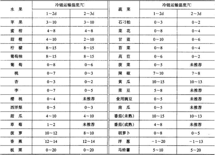 图4-3 低温流通系统模式图(绪方,1977) 低温流通在美国应用得较早。日本是在1965年提出的,1966年与1967年曾在全国范围内进行了307次、2255t的大规模实验,各县试验场以及销售单位都做了大量的工作,证明具有较高的保鲜效果,并已达到实用程度。但是,低温流通这项新技术,目前在我国基本没有得到实际应用,主要是在低温运输后存在不完全的低温管理,尚有一些不具备低温条件的流通环节,从而使低温运输的效果受到一定的损失。 低温流通的温度范围基本上与低温贮藏的适温相同,但实际上保持某一固定温度是困难的。在低温运输期间,产品随运载工具一起运动,外界环境不断改变,因此常会出现变温或短时间的低温中断等等。另外,从整个低温流通系统看,各环节之间也很容易出现变温及低温中断情形,在某种意义上说这是不可避免的。因此,要有一个温度变化范围,在此范围内也能收到相同的低温效果。每个环节延续的时间长短与保鲜所允许的温度变化范围相关,时间短允许变动的温度可以高些。为此,1963年国际制冷学会对果蔬低温运输的适温范围提出了一个参考数字,虽然这些数据因品种及栽培条件不同而有差异,但仍是一份重要的资料,1974年修订(如表4-2)。规定要求温度低的果蔬,运输时间超过6d者要与低温贮藏的适温相同。 表4-2 新鲜水果蔬菜低温运输的推荐温度(国际冷冻协会1974年推荐)