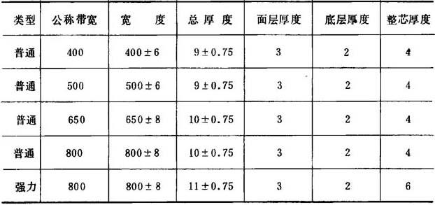 (三)整芯带规格 目前生产的运输带有五种规格,一般以带的宽度来划分,参见表4-7-19 表4-7-19 整芯带规格