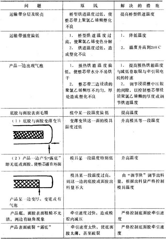 图4-7-14 输送带生产工艺流程示意图 1-预热器 2-PVC糊浸渍槽 3-压紧辊 4.5挤出机Φ60mn 6-模具 7-桥型烘道 8-输送带 生产聚氯乙烯塑料运输带时,先将整芯带通过预热器1,除去水分,然后进入浸渍槽2,使整芯带通过槽2内的浸渍辊而浸渍聚氯乙烯树脂糊。在通过几对加压辊压紧后,糊状树脂即渗入整芯带并使涂层达到一定的温度。接着进入桥型烘道使树脂塑化。涂有塑化树脂的整芯带进入挤出模具6与底、面胶相互汇合而成为制品。 挤底、面胶时,聚氯乙烯粒料自料斗分别加入两个对口排列的挤出成型机,由底胶挤出成型机4及面胶挤出成型机5,同时把聚氯乙烯带状物挤入模具6,使底、面胶在模具6内与含有已塑化的树脂的整芯带粘合成一个整体后挤出模口,最后通过压紧辊、轧花辊及冷却定型牵引辊筒一直到卷取辊,成品包装。 (一)设备与机头 下面按流程图的顺序,分别列出实际生产的主要设备及其规格尺寸以供参考。 1.挤出成型机 规格为Φ60mm的挤出成型机共两台,长径比为1:18,压缩比为1∶34的单螺纹等距渐深螺杆,螺距为45mm。 2.机头 采用两对合为一的扁平模。 3.辅助装置 (1)预热烘箱 规格为:1000×680×320mm,内设电阻丝板一组约10kW,与整芯带间距为50mm。 (2)浸渍槽 规格为:2000×800×540mm,两只开口槽。槽内各设有一个Φ100×50mm的引入辊;Φ150×510mm的浸渍辊6个以及两对φ150×510mm的加压辊。 (3)桥型烘箱 规格为:长2500×2500×2000mm,截面尺寸为320×800mm,内设12kW管型加热棒60根。整芯带与两侧加热棒的间距为70mm。 (二)配方及工艺条件 1.配方 运输带从其横截面来看,是由两层(聚氯乙烯)浸有聚氯乙烯糊的整芯带和底层)(聚氯乙烯)三层组成的。供底层与面层用的塑料是按表4-7-16中配方(1)配制的;浸渍芯带用的聚氯乙烯糊是按配方(2)在常温下搅拌配制的。 表4-7-16 配方示例