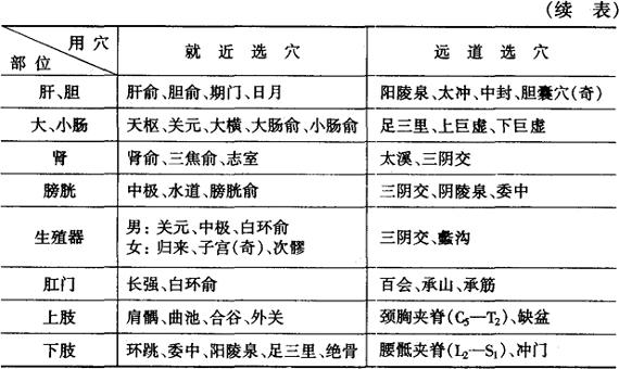 | 释义 | 远近配穴法 由于四肢与头面、躯干之间的经络有“根”与“结”、“本”与“标”的远近联系,并通过经脉的左右联系和手足同名经上下联系关系,从而产生了有病部位(近)与无病部位(远)的近远配穴法。这种配穴法,历代医家都经常应用,它是近部选穴与远道选穴法的结合。例如《百症赋》中的“目中漠漠,即寻攒竹、三间;目觉 远近配穴处方举例,见表4-14。 表4-14 远近配穴处方举例表