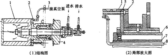 图2-8-13 连续滚筒式热成型-充填-封口机的成型装置 1-成型滚筒 2-连接阀板 3-气管 4-齿轮 5-端盖法兰 6-转轴 7-空心轴 8-水管成型滚筒采用传热性较好的铝合金类金属制作。抽气小孔一般设置在成型孔腔的边角处,其孔径一般为0.5~0.8mm。 2.2 热封合装置 封合方式多采用辊式滚压热封合,如图2-8-14所示。由主动辊和热压辊组成,热压辊表面设有网纹(图2-8-2),主动辊内装有加热元件,温度可调控,其表面有与成型形状相同的孔腔,用于成型塑片成型。当两辊对滚时,已充填物料的成型塑片和覆膜被加热、加压,实现热封。PVC和铝箔的封合推荐温度为190℃±20℃,动压力为0.4~0.6MPa,速度越快,温度、压力应越高。