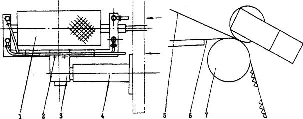 图2-8-14 连续滚筒式热成型-充填-封口机的热合装置示意图 1-热压辊 2-调节螺栓 3-支撑轴 4-支座 5--覆膜 6-成型塑片 7-主动辊 连续滚筒式热成型-充填-封口机的冲裁装置与间歇式相似。 |