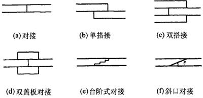 纤维增强金属基复合材料接头中纤维的不连续性直接影响了材料的强度和刚度。因此,为了改善接头的性能,必须合理地设计接头形式。金属基复合材料的一些典型接头设计形式如图2-10-3。采用对接接头时,由于焊缝中增强纤维的不连续性,不可能实现等强度焊接,接头强度和刚度远远低于母材。采用搭接接头时,接头强度可通过调整搭接面积来改变,随搭接面积的增加而增加。理论上讲,当搭接面积增加到一定值时接头的承载能力可达到母材的承载能力。但搭接接头增加了焊接结构的质量,而且接头的形式是非连续的,因此其应用受到很大限制。最理想的接头形式是台阶式和斜坡式对接接头,这两种接头的最大特点是将不连续的纤维分散到不同的截面上,如图2-10-3e、f所示。台阶的数量和斜口的角度可根据受力情况以及所用的焊接方法进行设计。