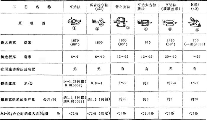 | 释义 | 连铸连轧法(连续铸造压延法) 这种方法是从熔化的铝液直接生产出板材或线材。这种工艺,由于省去了中间的热轧工序,所以是一种以廉价和高效率生产制品的尝试。这对于根据不同的用途来制造产品,是有很大效果的。 表9与表10,示出此种方法的大概情况。 表9 板材的直接铸造工艺(代表例)