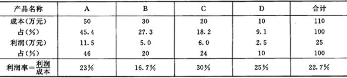 图5.2.2-1 零件的成本分配曲线 成本比重法的实质在于先把产品每个零件按成本大小的顺序列出,选与成本占总成本约70%的零件作为A类零件并为重点研究对象,其次是B类,C类不作为分析对象。这样便可以保证用较少的投入取得较大的产出。 2.百分比法 百分比法是通过分析不同产品在各类技术经济指标中所占的百分比不同进行比较来选择对象的方法。可以从各种消耗,也可以从利润进行比较。 例如,某企业有四种主要产品,其成本和利润所占百分比,如表5.2.2-1所列。由表可知,利润率最低的产品是B,就可选择它作为重点分析对象。 表5.2.2-1 百分比法的计算