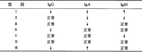 | 释义 | 选择性低丙种球蛋白血症 【释义】: 选择性低丙种球蛋白血症病因尚不清楚,遗传方式也尚不完全明了,有些病例报告为常染色体显性或隐性遗传。系由于免疫系统对抗原刺激的应答不充分,只能分泌一种或两种免疫球蛋白,其他的免疫球蛋白正常,甚至增高。根据IgG,IgA,IgM在血中的水平,可分为七型,见表10-1。 表10-1 各型IgG,IgA,IgM水平分布