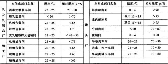 | 释义 | 通风与空调 通风与空调的设计内容包括:车间的夏季空调或降温、设备或工段的排气和通风以及某些物料的风力输送等。通风与空调的目的是为了改善工人的劳动条件,保证产品质量,防止建筑物的发霉,改善工厂卫生。 (一)通风与空调的一般规则 1.优先考虑自然通风 食品生产车间的方位应根据车间的主要进风面和建筑形式,按夏季最有利的风向进行布置,使之最有利于自然通风。同时,要从卫生的角度考虑,防止外界有害气体或粉尘的进入。 2.人工通风 当自然通风达不到应有的要求时,要采用人工通风。当夏季工作地点的气温超过当地夏季室外计算温度3℃时,每人每小时应有的新鲜空气量应不小于20~30m3/h。当工作地点的计算温度大于35℃时,应设置岗位吹风。吹风的方向应从工人前侧上方倾斜吹到人体的头、颈和胸部。吹风的风速在轻作业时为2~5m/s,重作业时为3~7m/s。另外,在有大量蒸汽散发的工段,不论其气温高低,均需考虑机械排风。 3.空调车间的温湿度要求 空调车间的温湿度要求,随产品的性质或工艺要求而定,焙烤食品工厂的有关指标可参照表5-3-24中其他食品厂的数据,提出焙烤食品各有关车间的温湿度的具体要求。一般温度要求为22~28℃,其中包装车间可低一些,原料处理车间可高些,而烘焙车间则以通风为主,不安装空调设备。 表5-3-24 食品厂生产车间的温度和湿度