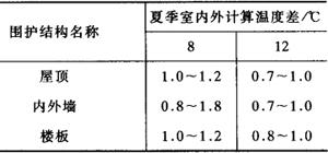 式中 G——渗入空气量(kg/h); dH、dB——分别为室内外空气含湿量(kg/h)。 (5)总散湿量W(kg/h): W=W1+W2+W3+W4 3.送风量的确定 从室内总耗冷量Q和室内总散湿量W算出热湿比ε(ε=Q/W),再根据车间空调要求的温度fB和相对湿度φ0,查出室内空气热焓IB,最后按下式计算送风量: G=Q/(IB-IK) 式中 IB、IK——室内空气热焓及空气处理后状态点的空气热焓(kJ/kg)。 IK的确定如下:根据空调所要求的室内温度和湿度,在空气热焓及含湿量即I-d图上定出B点,过B点依已知热湿比相对的斜线做一平行线,与相对湿度90%(K点φ值一般为90%~95%)的曲线的交点即得K点,由此可查出IK值。 送风量确定后,可求出总需冷量: Qi=G(IC-IK) 式中 Qi——总的需冷量(kg/h); IC——室内外空气混合点的空气热焓(kJ/kg)。 IC的确定如下:根据室外空气的温度和相对湿度在I-d图上定出H点,连结B点和H点,在BH线上取C点,使BC/BH≥1/10,得出C点即可查出IC值。但要核算10%的新鲜空气量能否满足每人30m3/h的要求。 (三)空调系统的选择 按空调设备的特点,空调系统分集中式、局部式或混合式三类。 1.局部式空调 局部式的主要优点:土建工程量小,易调节,上马快,使用灵活。其缺点:一次性投资较高,噪音也较高,不适于较长风道。 2.集中式空调 集中式空调系统主要优点:集中管理、维修方便、寿命长、初投资和运行费用较低,能有效控制室内参数。 集中式常用在空调面积超过400~500m2的场合。空气处理过程常由空调箱内的“冷却段”来完成。这种冷却段,可采用喷淋低温水,当要求较干燥的空气时,可采用表面或空气冷却器。这时,为了节能,除采用一次回风外,还可采用二次回风。若需进一步提高送风的干燥状态,可再辅以电加热或蒸汽加热。空调房间内一般应维持正压,以保持车间卫生。 3.混合式空调 混合式空调系统介于上述两者之间,即既有集中,又有分散,如诱导式和风机盘管等。 (四)空调车间对土建的要求 1.空调车间布置原则 尽可能减少邻室外方的围护结构,需要空调的车间尽可能集中,以减少邻室对空调车间的影响;车间建筑需满足气流组织、风管布置等方面的要求。 2.围护结构的热工要求 (1)空调车间对屋顶、墙、楼板的导热系数K值的要求(见表5-3-25)。 表5-3-25 围护结构的导热系数K(W/m·K)