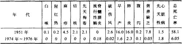 图12-2-1 遗传因素和环境因素在不同疾病发生中的作用图解 图12-2-1中将疾病分为4大类: 1.由遗传因素决定发病,还未发现环境因素的作用 这类疾病的发病并非与环境因素无关,只是还未发现什么特定的环境因素是发病所必需的。例如,成骨发育不全症、先天性肌弛缓和染色体病。 2.基本上由遗传决定,但是需要环境中一定的诱因才发病 例如,半乳糖血症必须是纯合隐性的婴儿吃了乳食以后,才诱发本病;蚕豆病则除了具有X连锁基因所致的莆萄糖-6-磷酸脱氢酶(G6PD)缺乏以外,还需要吃蚕豆才能诱发溶血性贫血。 3.遗传因素和环境因素对发病都有作用,在不同的疾病中遗传因素对发病作用的大小是不同的 在这类病的发病中,遗传基础是多基因,它和环境因素共同决定机体易患性的高低。遗传基础在易患性上所起的作用大小叫遗传度,作用愈大,遗传度愈高,环境因素所起的作用愈小;相反,遗传度愈低,环境因素所起的作用就愈大。例如哮喘、精神分裂症、幼年型糖尿病、先天性幽门狭窄、唇裂和腭裂等都属于这一类疾病,其遗传度较高,为75~80%。这表明遗传因素对这些病的发病来说具有重要作用,而环境因素的作用就要小一些。另一些疾病,例如,消化性溃疡等,其遗传度较低,不足40%。这表明遗传因素在这些病发病中的作用较小,而环境因素则有重要意义。 4.发病基本上取决于环境因素而与遗传无明显关系 例如坏血病、某些烈性传染病等。 上述1、2、3类疾病都有明显的遗传基础,只是在发病上所起的作用的大小各有不同,总的来看,都可以认为是遗传病。 三、遗传病的重要性 说起遗传病,一些人往往觉得那是一些罕见的、无法治疗的病。其实,并非如此。遗传病是否罕见呢?近二三十年来,由于医疗卫生事业的发展,传染病、流行病在人群中的发病率逐渐降低,而遗传病和先天畸形的相对发病率则在逐渐增高。例如,以北京市1951年婴儿主要疾病死亡原因和1974~1976年者相比(表12-2-1),可以清楚地看出,20多年来,随着儿童保健工作的发展,婴儿死亡率降低近10倍。一些传染病、细菌或病毒感染所造成的疾病,以及营养缺乏等在婴儿死亡上的作用,有明显的降低。相反,与遗传有关的先天性心脏病在婴儿死亡上的作用,则变得较明显。先天性心脏病作为婴儿死亡原因来看,1951年时只占全部婴儿死因的2.6%,列为各种疾病死因中的倒数第3位;1974~1976年,它就占全部婴儿死因的30%,列为各种疾病死因中的第2位。 表12-2-1 北京市1951年与1974~1976年婴儿主要疾病死亡率(‰)的对比