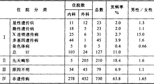 如表中所列,人类中染色体畸变的发病率为0.5%,各种单基因遗传病(不包括先天性红绿色盲)为3.5%,多基因遗传病中先天畸形为2%,常见病为16%;合计约22%的人患有遗传病或与遗传密切有关的疾病。即使除去多基因遗传病,确定由遗传所致的疾病也占人类的4%。因此,遗传病对人类健康影响较大,应作为遗传学与医学科学的一个重点研究对象。 |
