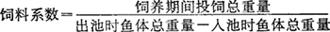 公式中的代谢氮是指鱼类不吃任何含氮饲料的情况下,由排粪便中测出的氮量。内源氮是指鱼类不吃任何含氮饲料时尿中排出的氮量。 一般地说,凡蛋白质生物学价值较高的饲料,它所含各种必需氨基酸较为完备,因而利用率较高,通常说它的蛋白质品质较高。 (3)饲料系数和饲料效率 投饵量和量的增重量之比,称为饲料的转换率或饵料系数。一般说来可以表明某种饲料的质量高低。凡是营养成分含量高的,又容易为鱼类消化吸收的饲料,必然是饲料系数低,饲料效率高;反之,则相反。当然饲料系数的大小和饲料效率的高低,不仅取决于饲料的本身,而且还要受到饲养方法及环境条件等诸因素的影响。 ①饲料系数。简单地说就是几斤饲料长1斤鱼。说得准确些即:饲养期间所投饲的总量与鱼在此期间的增重量的比。用下式表示: