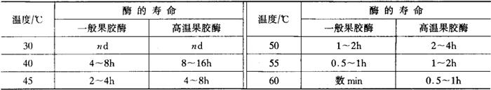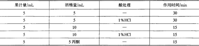③酶制剂应在正常pH范围内使用,当pH低于3.0时要考虑推荐剂量的上限或使用专用酶。另外多酚类物质含量较高,或在含有醇、SO2以及在基质中有其他酶制剂存在时都会抑制酶的作用或加速酶的失活。为避免这种情况出现,可在加酶前添加明胶或增加酶的剂量。 ④酶制剂可直接加于果蔬榨汁或浸汁中,也可加于经过加热杀菌的果蔬汁中。前者加入的酶制剂可与果蔬汁中的原有天然果胶酶协同作用,提高澄清效果。有时为了防止果蔬汁因氧化发生变色反应,或因微生物作用而引起发酵等腐败作用,可以先将果蔬汁迅速加热至80~85℃,经过灭酶杀菌,并冷却至55℃以后再加入酶制剂。 如上所述,酶制剂在果汁加工中的应用有各种影响因素,是一个非常复杂的课题。酶制剂的各种影响因素和使用参见表2-1-44,以供生产时参考。 表2-1-44 酶制剂的影响因素和最佳使用条件