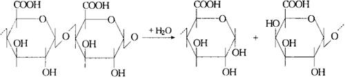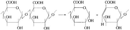 (二)果胶降解机理 果胶是高等植物细胞间质和细胞初生壁中的结构性多糖。果胶物质有原果胶、果胶和果胶酸三种形态。原果胶不溶于水,水解成为纤维素和果胶。果胶溶于水,具有一定的黏性,在果胶酯酶作用下变为果胶酸。果胶酸无黏性,对水的溶解度较低。 果胶主要构架是D-半乳糖醛酸(D-galacturonic acid),为a-1,4苷键,是具有15~30万分子质量的聚糖醛酸(Polyuronic acid)。用果胶酶分解果蔬汁中的高分子果胶,有两种酶系。一种是利用果胶酯酶(PE)和液化型聚半乳糖醛酸酶(endo-PG)的水解酶系,另一种是液化型果胶裂解酶系(endo-PL),作用机理见图2-1-8。