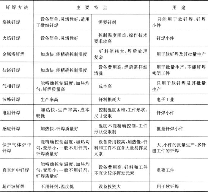 钎焊过程所采用加热钎焊接头的方法很多,可依据是工件的材料和尺寸、钎料和钎剂、生产批量、成本、各种钎焊方法的特点等合理选择钎焊方法。表10.5-1综合了各种钎焊方法的优缺点及适用范围。