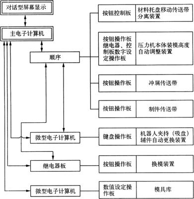 图1-15 冲孔-弯曲FMS结构 1.压力机 2.搬送机器人 3.坯料供给装置 4.料垛托架 5.换模装置 6.吊车 7.模具库 8.放置台 9.存放架 10、11.运送装置 12.工件托架 13.废料托架 14、15.操作盘 机器人用于上、下料,其活动度为4,最大合成速度为2.25rn/s。坯料供给装置将装载料垛托架上的板料送至机器人的吸料位置;每个托架上可堆放6垛板料,每个堆垛处都有升降机构,以保证机器人的吸盘能吸到板料。用吊车将仓库中的模架运到换模装置上,再用此装置将模架搬送到压力机上装好。工作台上用过的模架也可按相反的过程送回仓库的架子上。 这种FMS的控制部分是一种分级控制系统,其原理如图1-16所示,各装置既有相应的控制器,又可在主计算机的指挥下进行信息交换,并实现总体控制。该FMS由日本小松和芝浦电气公司研制,主要用于加工强电控制器的零件,适用于批量为20~400个的零件,工序种类包括冲孔、修边、精压和弯曲,且工序数量为1~3个工序的生产。