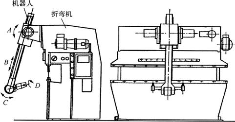图1-17 剪板-折弯FMS的结构 1.板料供给装置 2.吸料与转送装置 3.剪板机上下料装置 4.剪板机 5.折弯机器人 6.折弯机 7.工件输送带 8.中间料架 折弯机器人和折弯机是该系统的关键部分,如图1-18所示。折弯机器人属于多关节型,其各部分的运动参数如下: