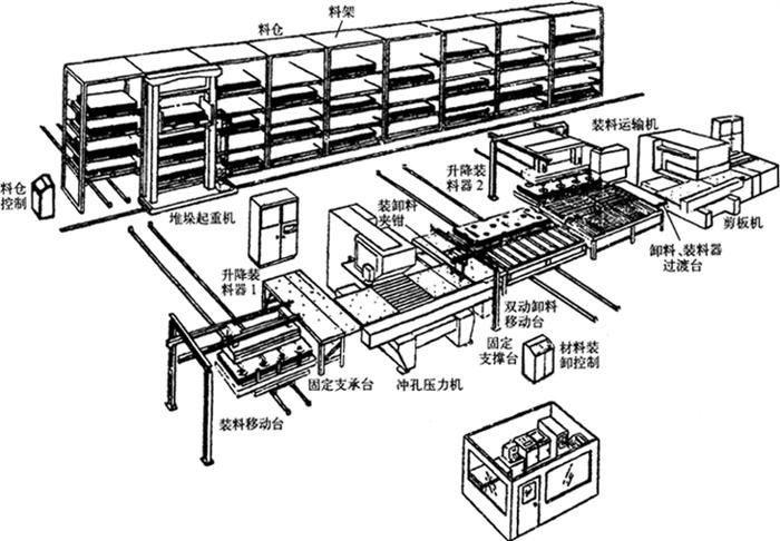图1-16 冲孔-弯曲FMS控制原理 (二)剪板-折弯FMS 图1-17是法国A.J.D公司和Colly公司研制的剪板-折弯FMS的结构。该系统由板料供给装置、吸料与转送装置、剪板机上下料装置、剪板机、折弯机器人、折弯机、工件输送带和中间料架等组成。
