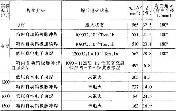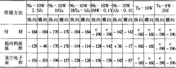(4)箱内钨极氩弧焊工艺参数举例 1)Mo-0.5Ti合金板厚1mm,Ⅰ型接头,不用垫板在充氩箱内用Φ3.2mm钍钨极,焊接电流150A(直流正接),电压17V,焊前须预热约650℃,焊时采用填充焊丝,焊丝牌号同母材;用垫板可不用填充焊丝,Φ2.4mm钍钨极,225A(直流正接),电压16V。 2)Nb-1Zr合金0.15mm端接,在充氩箱内用Φ0.5mm纯钨极,电流20~25A(直流正接),电压8V,焊速6.5m/h。 (5)真空电子束焊:钨最难焊。如能使焊缝处于受压缩状态,焊接及焊后冷却时不受拘束力,则效果较好。否则易裂。焊前应预热500~700℃,焊后应经980~1040℃消除应力。如采用脉冲电子束或摆动电子束(频率60Hz,摆幅2.5mm)可减小晶粒长大。 钼抗热应力裂纹稍好于钨。焊板厚1.2~2.5mm的Mo-0.5Ti的典型工艺参数为:预热320℃;135kV;焊速40.5m/h;电子束摆动频率60Hz,摆幅0.12mm。深宽比为4,热影响区的深宽比为2.2。 锆比钨、钼易焊,但锆合金焊后接头强度稍降(强度系数约75%)。 钽可焊性好,但由于导热系数大,焊接厚度大于1.6mm时,须迅速加热焊接,并利用铜冷却块加速冷却以防变形。 (6)熔化焊接头性能:钨、钼及Mo-0.5Ti的箱内钨极弧焊和真空电子束焊(厚板在1mm以上时),接头的脆性转变温度都在室温以上。0.5mm以下的薄板,接头脆性转变温度可接近室温。不能自由变形的钨及其合金焊件要预热到425~530℃以上,才能避免裂纹。 钽、铌及其大部分合金,焊接接头强度接近母材而塑性都有不同程度的降低,接头脆性转变温度通常在室温以下。常用的几种中强度钽、铌合金(1mm)接头最低弯曲脆性转变温度见表10-96。1mmNb-10W-2.5Zr合金接头的机械性能见表10-97。Zr-2合金性能见表10-98。 表10-96 几种钽、铌合金熔焊接头最低弯曲脆性转变温度(℃)