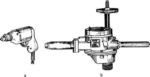 图3-19 各式钻床 a.台式钻床 b.立式钻床 c.摇臂钻床 台式钻床的主轴转速一般较高,最高转速接近每分钟万转,可通过改变三角胶带在塔形带轮上的位置来调节。主轴进给是手动的,为适应不同工件尺寸的要求,在松开锁紧手柄后,主轴架可以沿立柱上下移动。 (2)立式钻床:立式钻床简称立钻(图3-19b)。其最大钻孔直径有25mm、35mm、40mm、50mm等几种,其规格用最大钻孔直径表示。 立钻由电动机经带轮传递给主轴转动,并通过主轴变速箱获得需要的各种转速,一般钻小孔选用较高转速,钻大孔选用较低转速。主轴是在主轴套筒内作旋转运动,同时通过进给箱驱动主轴套筒作直线运动,从而使主轴一边旋转,一边随主轴套筒按所选的进给量,自动作轴向进给,也可用手柄实现手动轴向进给。 进给箱和工作台可沿立柱上的导轨调整上下位置,以适应不同高度工件的加工。 立钻的主轴不能在垂直其轴线的平面内移动,钻孔时要使钻头与工件孔的中心重合,就必须移动工件。因此,立钻只适于加工中小型工件。 (3)摇臂钻床:图3-19c所示为摇臂钻床,由于其摇臂带着主轴箱可沿立柱垂直移动,同时主轴箱还能在摇臂上作横向移动,所以再移动钻床主轴箱,便可将钻头位置对准被加工孔的中心,而不需移动工件便可加工。 因此,摇臂钻加工时工作可固定不动,而钻头转动切削且能随摇臂绕立柱旋转360°,这种钻床广泛应用于加工单件、成批量生产的大型工件和多孔工件。 工件通常安装在工作台上加工,如果工件很大,也可直接放在底座上加工,其最大钻孔直径可达100mm。加工时,根据工件上孔的位置不同,可将主轴左右移动调整到机床加工范围内的任何一个位置,根据工件高度不同,还可将摇臂沿立柱上下移动调整到加工位置,进给时可自动也可手动,但事先要锁紧摇臂及主轴箱,以免加工中由于振动而影响零件加工质量。 2.电钻 电钻是用手直接握持使用的一种钻孔工具,使用灵活,携带方便,场地不受限制,可加工钻床无法加工的工件上特殊部位的孔。 电钻的电源电压为220V或36V,其尺寸规格按所钻最大孔径分为6mm、 10mm、13mm等几种,其结构由电动机、减速装置、钻夹头、手柄和开关等组成,其种类有手枪式和手提式两种,如图3-20所示。