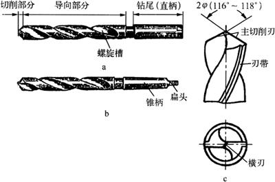 图3-20 各式电钻 a.手枪式 b.手提式 图3-20a的规格为6mm,即表示最大钻孔直径为6mm,电压220V,采用双重绝缘结构,安全性能好,但必须安装漏电保护器才能使用。图3-20b的规格为13mm,采用双侧手柄结构,带有托板。一个侧手柄内附电源开关,另一个侧手柄用圆锥管螺纹连接,双手柄便于操作,后托板便于用胸顶或用杠棒加压,以便附加较大的轴向力。 (二)加工工具及附件 1.麻花钻头 麻花钻是钻孔的主要刀具,其由柄部、导向部分和切削部分组成。 (1)柄部结构:柄部是钻头的夹持部分,用于传递钻孔时所需的扭矩和轴向力,并使钻头轴线保持正确的位置,其分直柄和锥柄两种。 1)直柄钻头:柄部呈圆柱形(图3-21a),用钻夹头夹持,传递的扭矩小,只适用于直径在13mm以内的钻头。