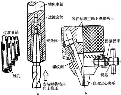 图3-22 钻头夹、套及钻头的安装 a.钻头套及钻头的安装 b.钻头夹 (2)钻头套:钻头套用于装夹带锥柄的钻头。一般锥柄钻头可以直接装入机床主轴的锥孔内,当钻头的尾部小于机床主轴锥孔时,则需用过渡的钻头套。当用较小直径的钻头钻孔时,则需用几个钻头套配合起来使用,才能与钻床主轴锥孔相配合。如图3-22a所示,共有五个型号,从小到大,其内径依次分别适用于直径为15.5mm、15.6~23.5mm、23.6~32.5mm、 32.6~49.5mm、49.5~65mm钻头。 |