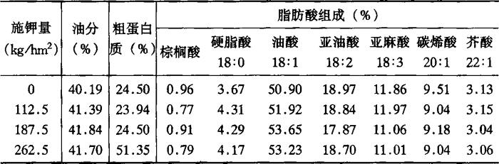 注:蛋白质用半微量滴定法,脂肪用索氏提取法,氨基酸用日立835-30型氨基酸自动分析仪测定。 2.钾对经济作物品质的影响 芥酸含量是评价油菜品质的重要指标之一,含量高的品质差,因为芥酸碳链较长,进入人体后不易被消化吸收。同时芥酸含量会限制营养价值高的油酸和亚油酸含量的提高。据南京农业大学徐光壁等人研究结果表明:施钾量对油酸含量有增加的趋势,对粗蛋白及芥酸含量没有影响(表5-15)。 表5-15 施钾对菜子品质的影响