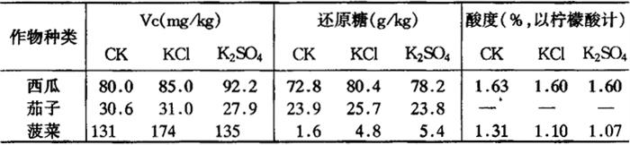同样是钾肥,其肥料品种不同,作物的反应也不同。番茄需钾较大,为需氮量的1.5~2.0倍。随着氮、磷施肥水平的提高,增施钾肥对提高番茄产量、改善品质、减轻病害有明显的作用。前面讲过,施钾能提高番茄和西瓜的糖含量,降低酸含量,增加水果的糖酸比,硫酸钾与氯化钾相比,Vc提高6%,酸度降低11%,糖酸比提高0.45,番茄风味得到改善。天津市农业科学院土壤肥料研究所许前欣研究结果也表明,在改善番茄品质方面,硫酸钾优于氯化钾(表5-19、表5-20)。 表5-19 不同钾肥处理对番茄品质的影响
