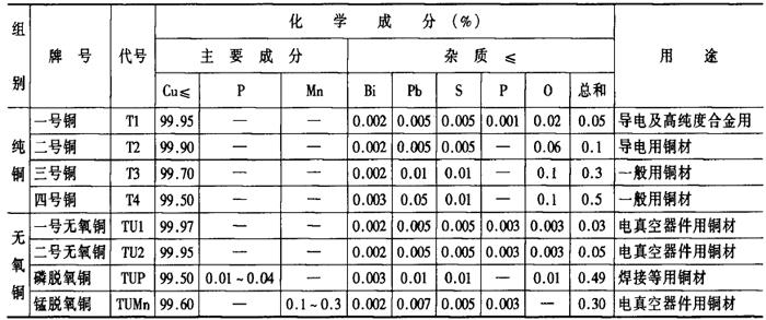 | 释义 | 铜及铜合金的成分及性能 1.紫铜 我国紫铜的主要成分和用途如表2-8-1所示,力学性能见表2-8-2。紫铜的熔点为1083℃,密度为(20℃)8.96kg/m3,导热系数为393.6W/(m·K),线膨胀系数17×10-6(1/K),电阻率(20℃)1.68×10-8(Ω·m)。紫铜在400~700℃的高温下强度和塑性显着降低,在热加工时应引起重视。 表2-8-1 紫铜的化学成分及用途[1]